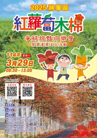◆ 114年3月17日(星期一)上午09:00開放(拔蘿蔔550名,彩虹奶凍杯手作40名)網路報名至「3月20日(星期四)下午17:00」或「拔紅蘿蔔報名及彩虹奶凍杯手作報名額滿時」截止報名。詳見活動報名網址:https://www.beclass.com/rid=294fe116799e39e0971e