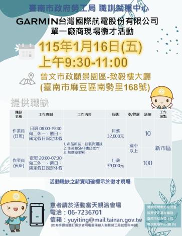 (一)徵才時間:115年1月16日(五)上午9時30分至11時。(二)徵才地點:曾文市政願景園區致毅樓1樓大廳(臺南市麻豆區南勢里168號)。(三)參加方式:歡迎求職者於活動當日著正式服裝親洽現場填寫履歷表,洽詢專線06-7236701,佳里就業服務台/尤小姐。