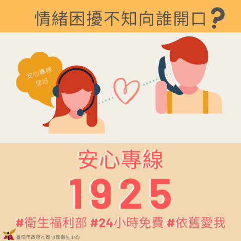 您倘有心理壓力或情緒困擾, 可撥打衛服部📞1925安心專線(依舊愛我),提供24小時免付費心理諮詢服務。